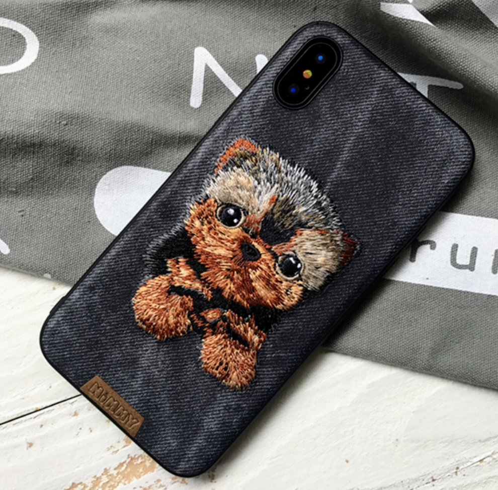 Читать все СтатьиПластиковый чехол-накладка с вышивкой для iPhone X собака, цвет серая джинса.