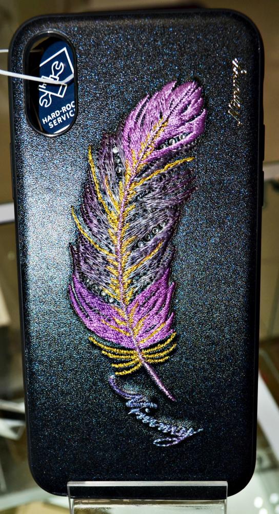 Читать все СтатьиПластиковый чехол-накладка для iPhone Xs с вышивкой перо со стразами, цвет черный с синими блестками.