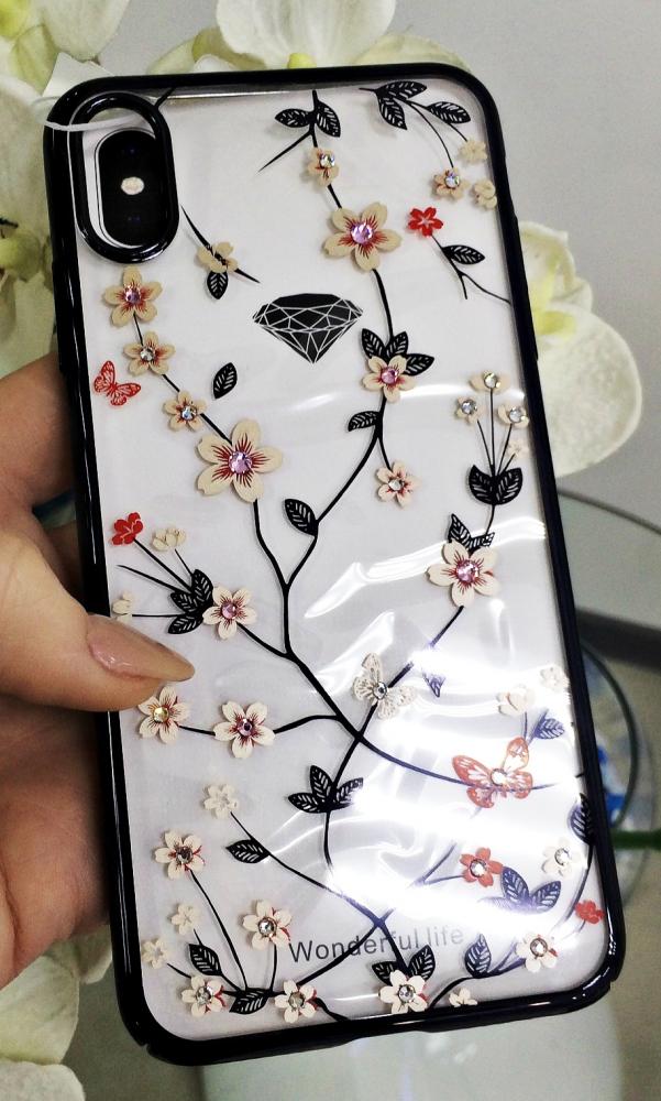 Читать все СтатьиПластиковый чехол-накладка для iPhone XS-Max прозрачный рис.цветы со стразами, цвет черный.